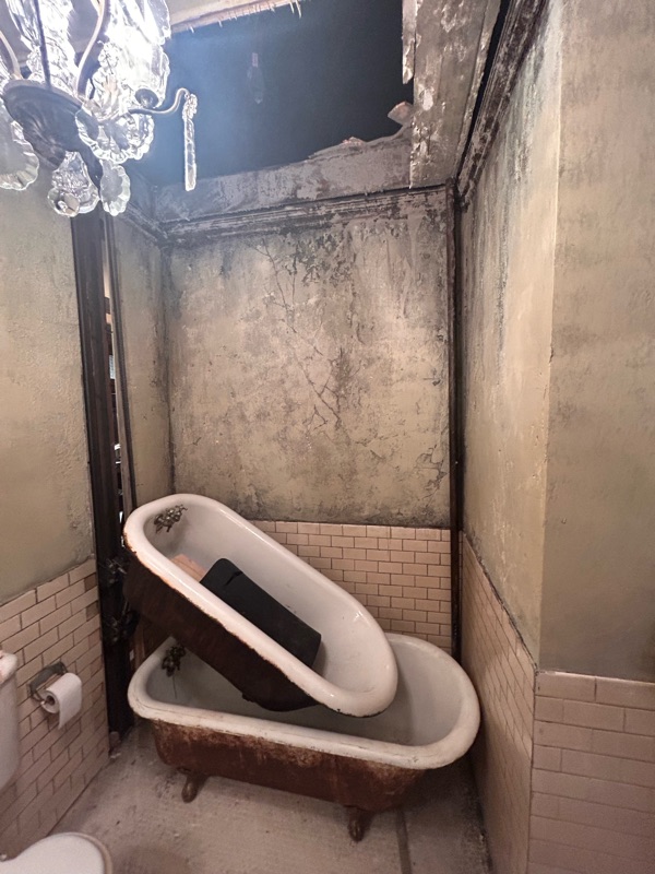 and here's that gnarly scene, shot on iphone thru another crew's monitor, when the bathtub that Marty/Timmy Supreme/Chalamet is bathing in crashes thru the rotten floor onto the guy in the bathtub below, crushing him, but also exciting the audiences world wide: